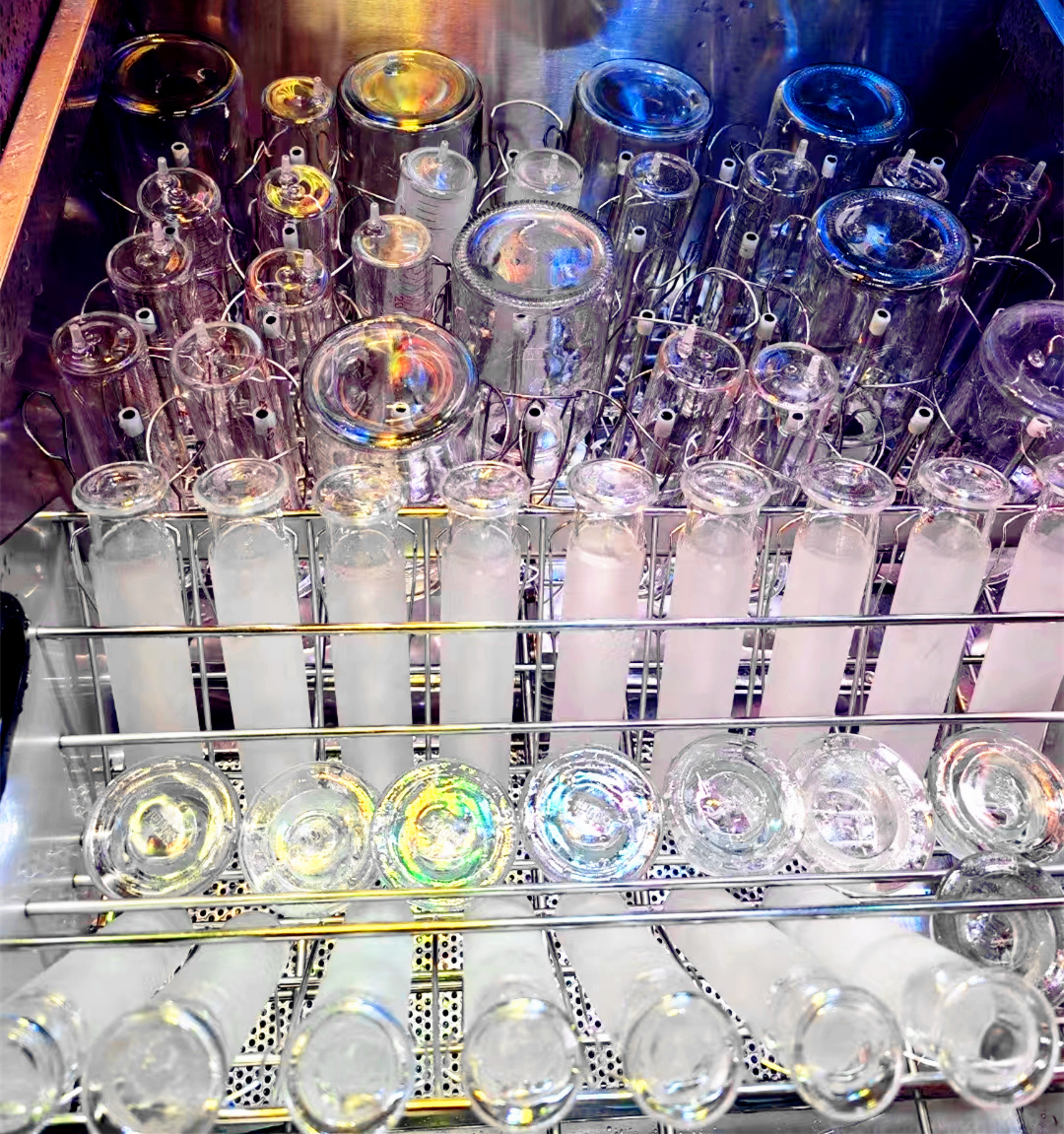 - “裝瓶”:把各種形狀的玻璃器皿,倒置插入專用的組合清洗籃架。